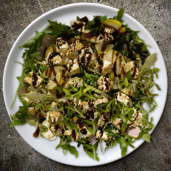 50 g fresh arugula 1 ripe pear 50 g soft cheese (mozzarella or goat cheese) 1–2 tsp sesame seeds 2 tbsp Fondo Gionino Novello olive oil 1 tsp Villa San Donnino balsamic vinegar Salt and freshly ground black pepper, to taste