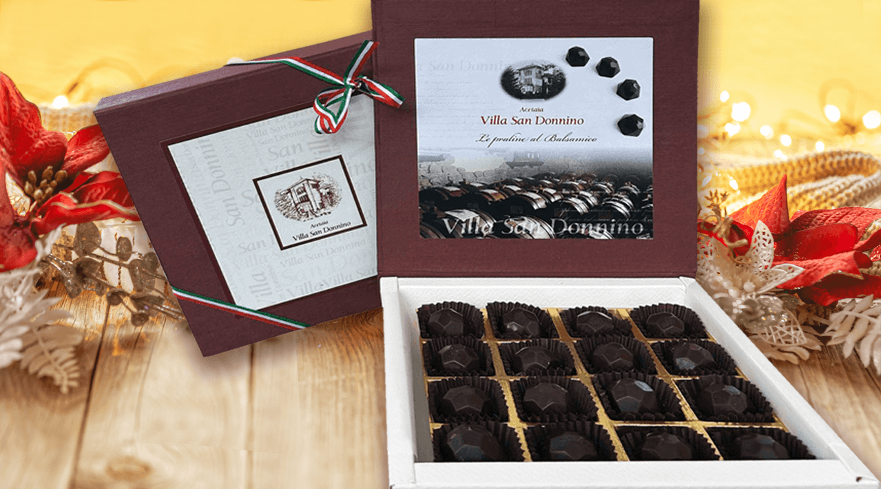Balsamic chocolates are artisan dark chocolates filled with a balsamic vinegar cream or ganache, made using San Donnino’s aged balsamic: deep cocoa bitterness on the outside, and a soft, sweet-tangy balsamic center on the inside.